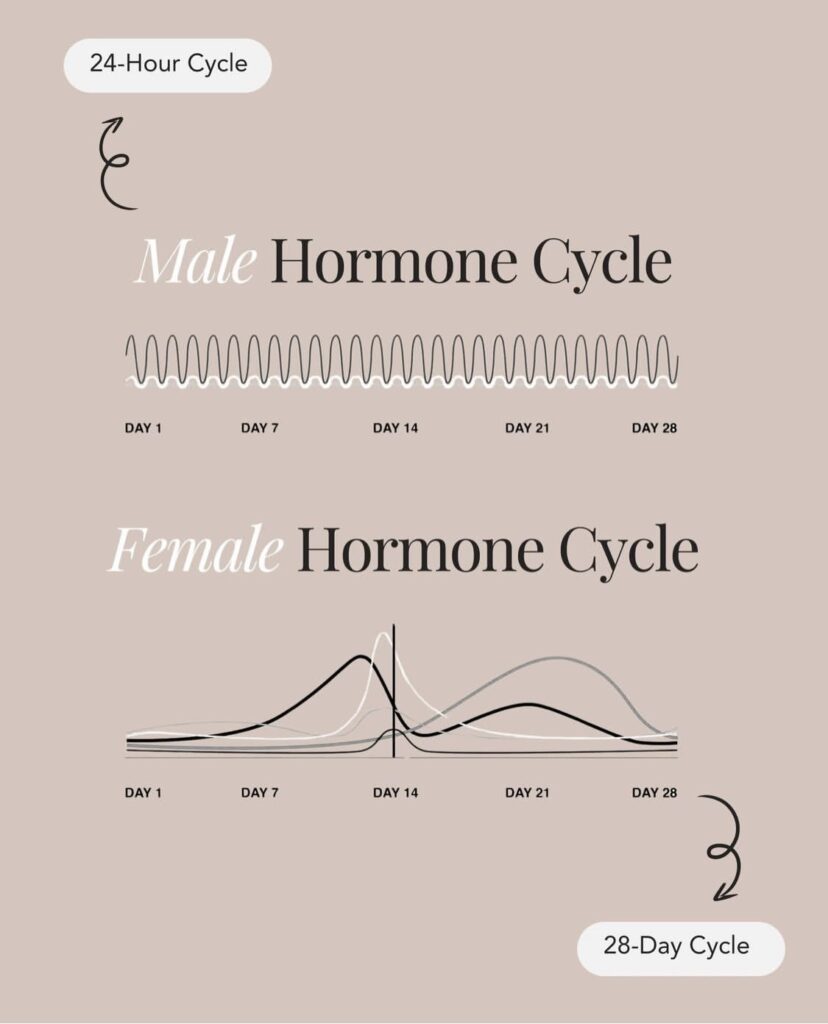 Women, however, operate on a roughly 28-day cycle. As she runs through her month, her dominant hormones of estrogen and progesterone rise and fall throughout the menstrual, follicular, ovulatory, and luteal phases. With each phase, her body requires different things to function properly. During the month, she may require more rest; she is naturally more introspective and needs to go inward. At other times, her hormones tell her she could climb a mountain. She may feel super creative and outward-focused. There are times of the month when a woman naturally feels more sexy, more motivated, and less weighed down. There are times when she feels like nesting, sleeping, crying, and praying. And none of these things are wrong!