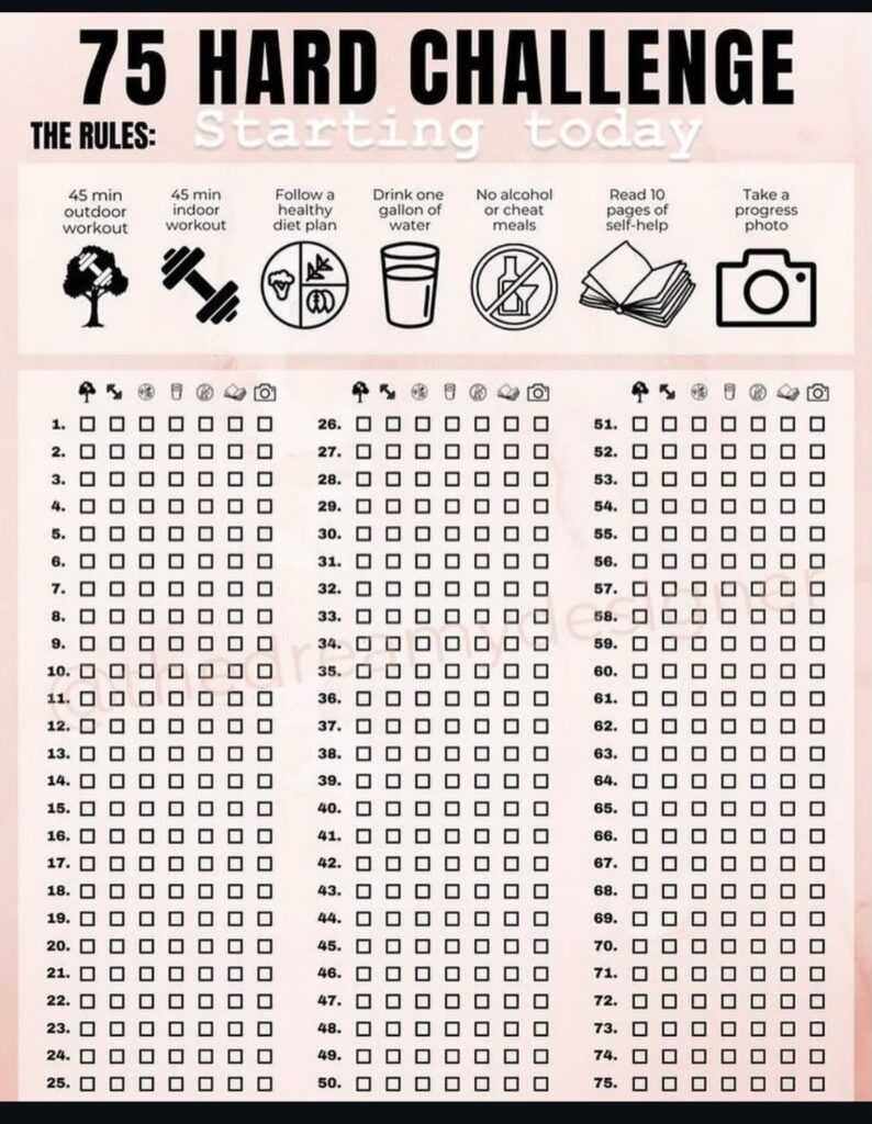 First, let’s look at what this program is. It consists of six daily disciplines you strive to implement every day for 75 days. If you mess up, skip a day, or only do 5 out of 6, you have to start over! Only those with real grit make it to 75.